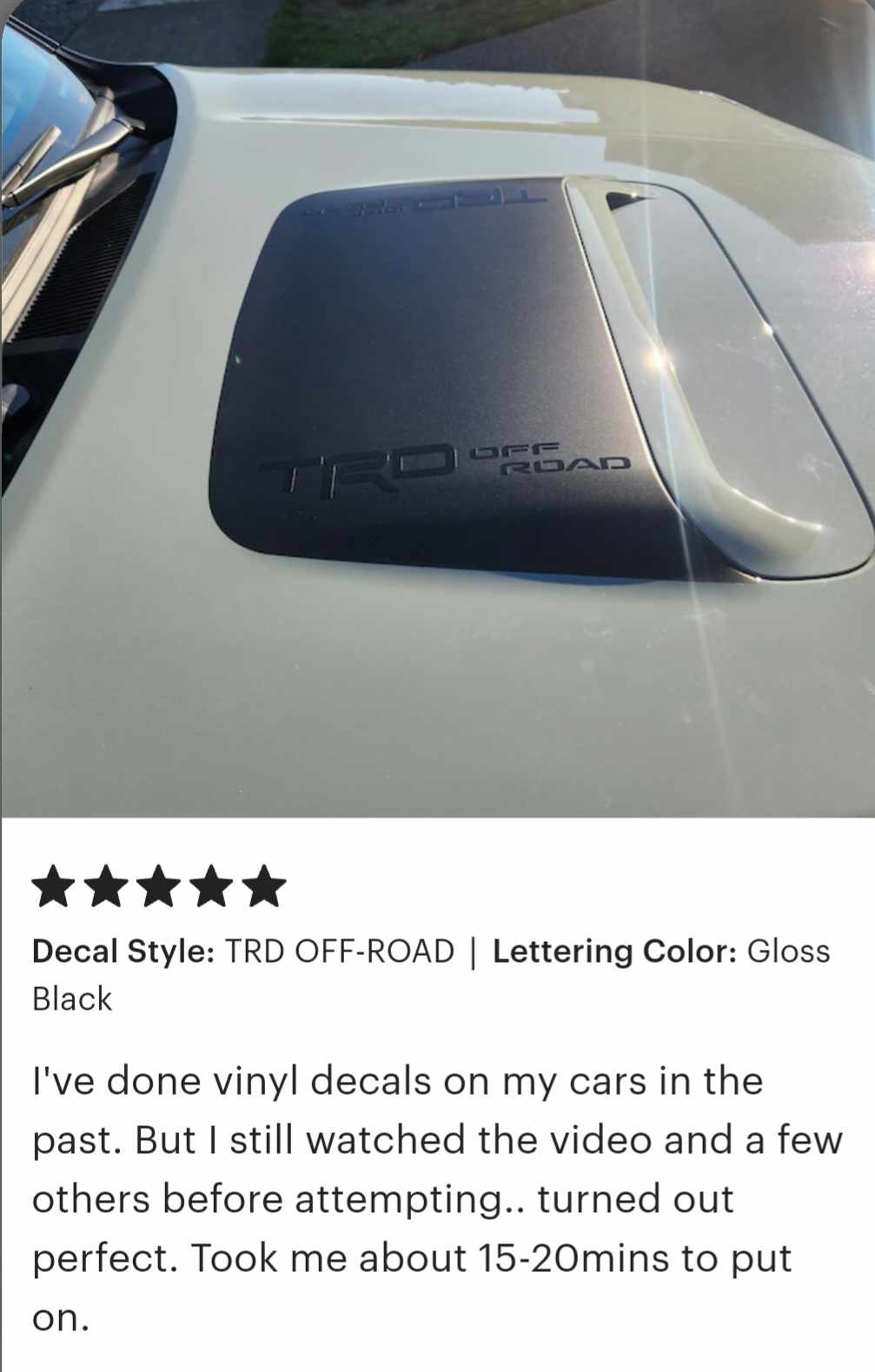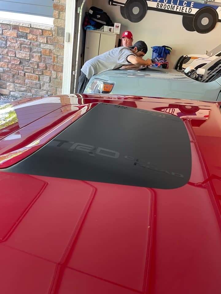Here is Our Hood Scoop (Sun-blocker) Overlay Decal For your 5th Generation Toyota 4Runner (2010-2023) . Many members on the 4runner Facebook pages have acquired them and absolutely Loved them, They are produced on high quality Oracal All-weather Vinyl with a 6 year manufacturer warranty against fading or shrinking . It's a pretty Simple to Install with our included installation video and it makes a world of a Difference looks-wise and on those sunny commutes you'll no longer deal with the awful glare in your eyes .